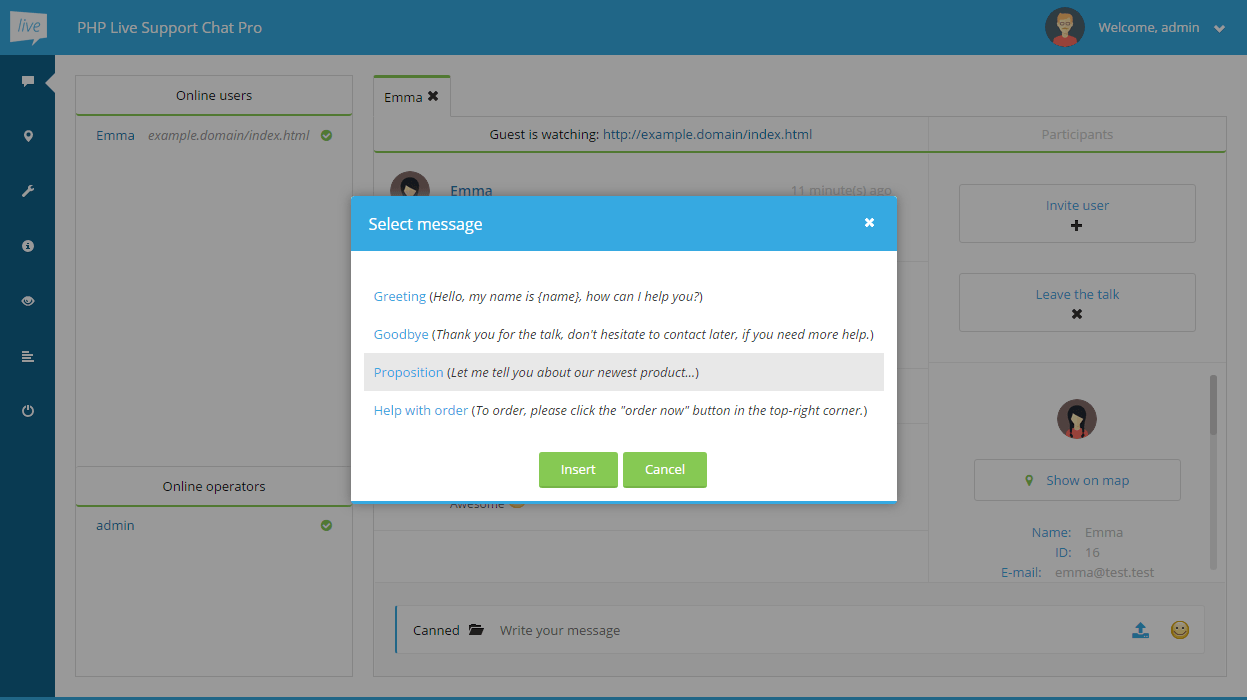 To use canned messages, click the Canned button (on the left of the message input field) when talking to a guest. The following