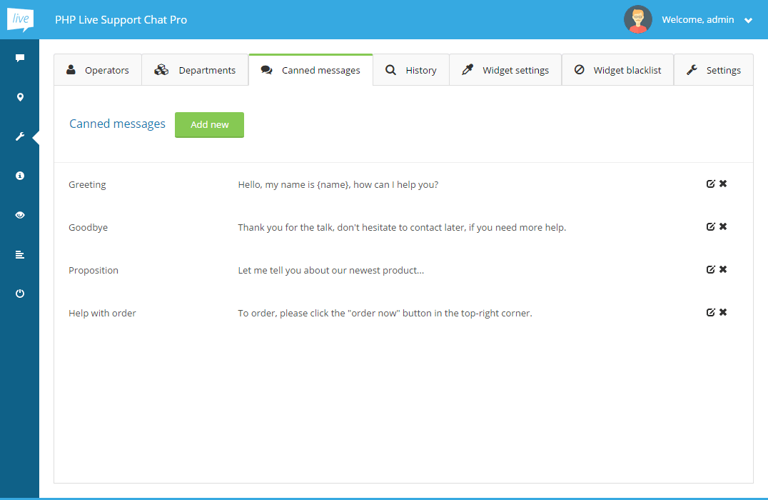 The application allows you to create a list of messages that can be quickly pasted into conversation with a visitor. You can manage them