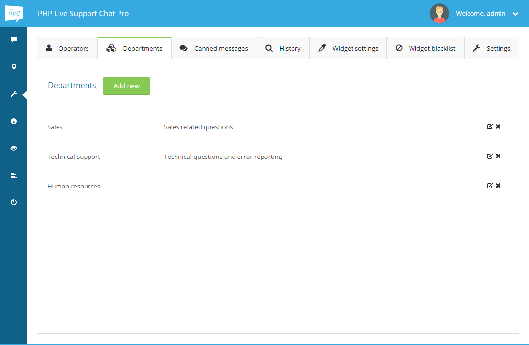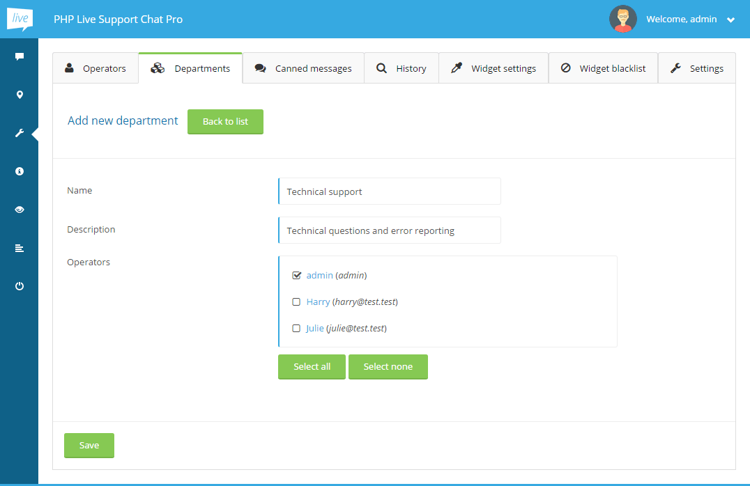 Fill the form with the department's data, select the operators you would like to be assigned to this department and click Save.
