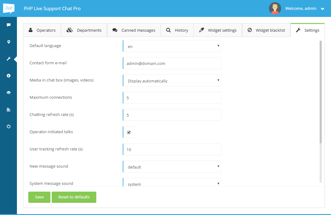 the new files and enable you to choose one of them using New message sound drop-down menu in admin's panel Settings tab.