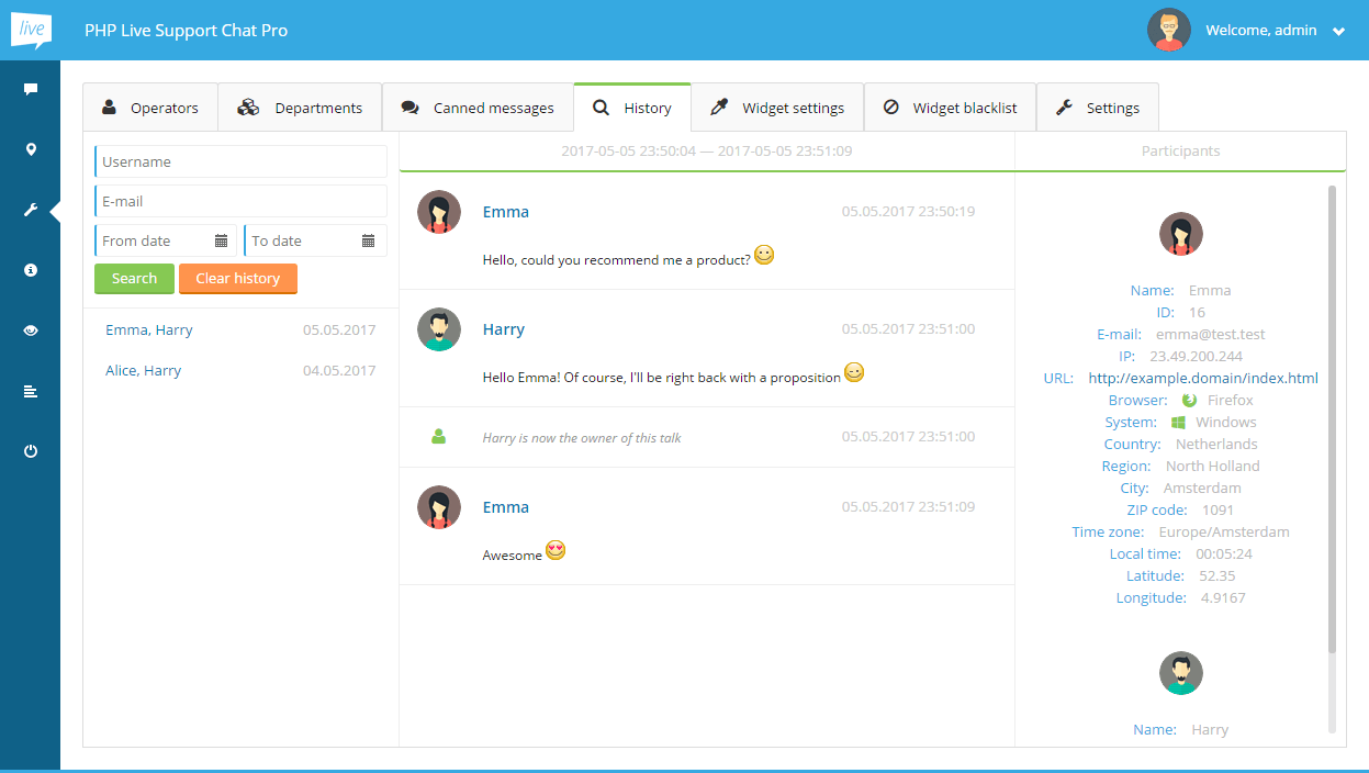 History section allows both admin and operators to browse and search through the whole conversation history. Leaving all of the filtering inputs empty will result in all of the talks being listed. To show a given conversation after it's found click the item on the results list under the search form and the talk will be displayed on the right. In the talk's view you can also see its participants profile information and talk's start/end date and time.