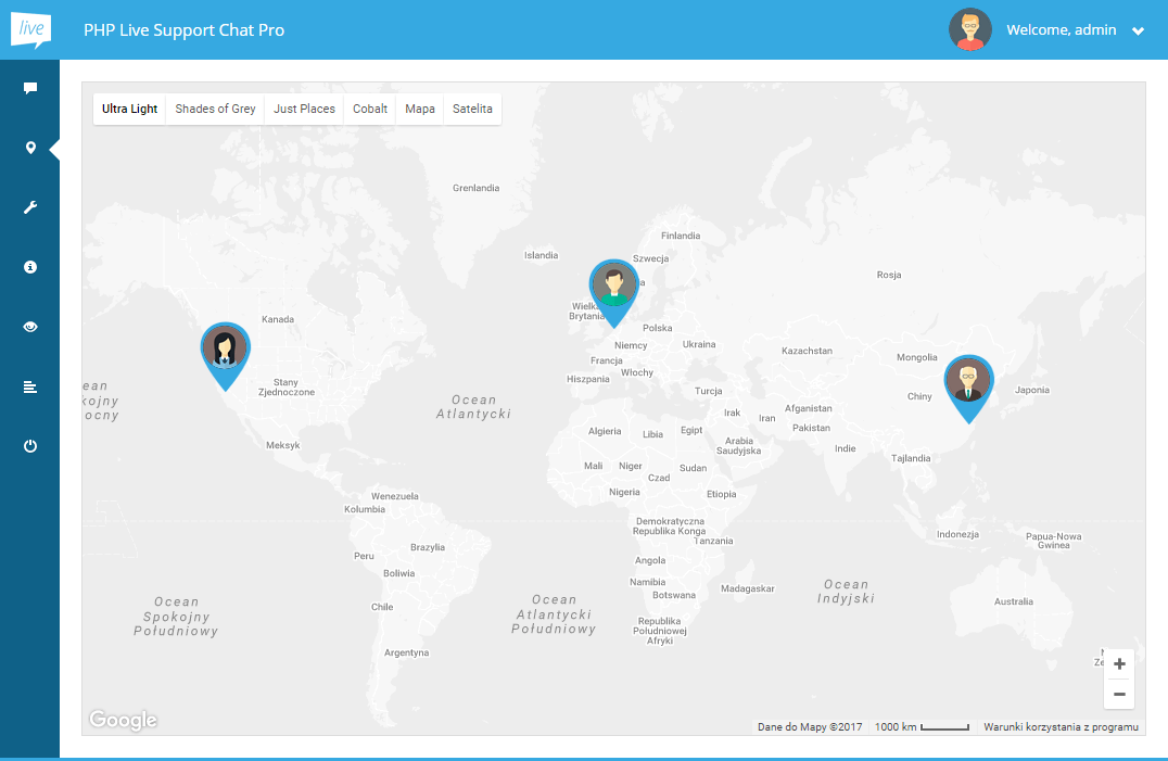 To display a map with all currently chatting visitors click the map marker icon on the left. Guests are represented on the map as markers containing their avatars. You can click on the marker to show the talk of the given user.