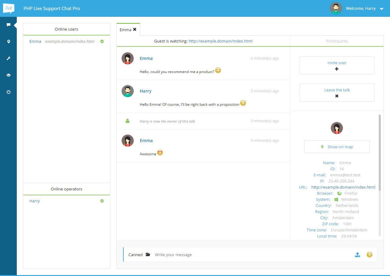 Conversations between two operators are also possible - just click operator's name on the list of online operators.