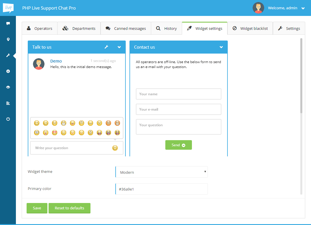 There are 3 user types in the application: admin, operators and guests. Admin is the user that can run (un)installation, change global settings, manage operators and browse chatting history, but is not allowed to chat. Operators can chat with online guests and once at least a single operator logs in, chat widget won't display the contact form no more - guest login form will be displayed. Operators are also allowed to change their profile data and browse chat history. Guests are the visitors to your website that log in through the chat widget and talk with operators.