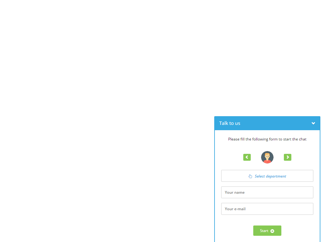 After creating at least one department, visitors of your website will be required to select a department when starting the talk. In case no departments are defined or online operator isn't assigned to any department, department selection will be hidden. Department selection view can be seen below. Online departments are listed first and marked with a green bullet on the right. Offline departments are marked with red bullet and aren't clickable.